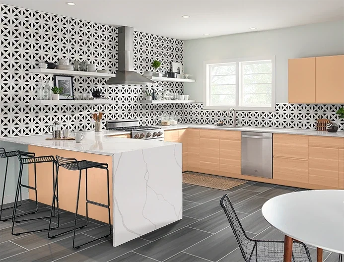 Calacatta Quartz strikes a perfect balance between modern and traditional, offering design versatility in your transitional kitchen. Waterfall islands make a statement while still complementing cabinetry in both neutral and bold tones. Full-height quartz backsplashes deliver sophistication without compromise in terms of a balanced, adaptable look.